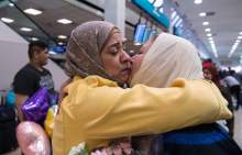 l-r Nisreen Alsaadi smiles as she is hugged by repeatedly by her sister-in-law, Iman Alsaadi during their greeting for the first time in seven years at the Salt Lake International Airport, February 8, 2017. Nisreen Alsaadi and her son Zaid Alsaadi were allowed to come to the U.S. after a judge on Friday temporarily blocked President Donald Trump's ban on people from seven predominantly Muslim countries from entering the United States.