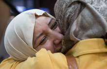 l-r Nisreen Alsaadi smiles as she is hugged by repeatedly by her sister-in-law, Iman Alsaa