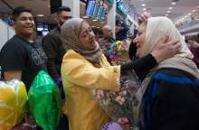 l-r Nisreen Alsaadi and her son Zaid Alsaadi wave at Iraqi family members after their arri