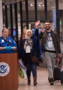 l-r Nisreen Alsaadi and her son Zaid Alsaadi wave at Iraqi family members after their arrival February 8, 2017 at Salt Lake International Airport. The Alsaadi's were allowed to come to the U.S. after a judge on Friday temporarily blocked President Donald Trump's ban on people from seven predominantly Muslim countries from entering the United States.