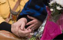 Iman Alsaadi and her Iraqi sister-in-law, Nisreen Alsaadi hold hands upon seeing each other for the first time in seven years at the Salt Lake International Airport, February 8, 2017. Nisreen Alsaadi and her son Zaid Alsaadi were allowed to come to the U.S. after a judge on Friday temporarily blocked President Donald Trump's ban on people from seven predominantly Muslim countries from entering the United States.