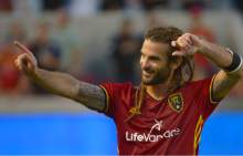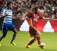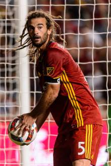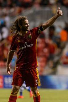 Real Salt Lake midfielder Kyle Beckerman (5) handles the ball before a corner kick as Real