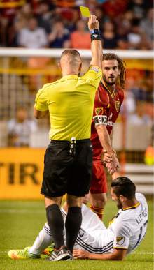 Real Salt Lake midfielder Kyle Beckerman (5) pulls up Los Angeles Galaxy midfielder Sebastian Lletget (17) as he (Beckerman) receives a yellow card as Real Salt Lake hosts the Los Angeles Galaxy, MLS soccer at Rio Tinto Stadium in Sandy, Wednesday September 7, 2016.
