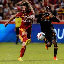 Real Salt Lake midfielder Kyle Beckerman (5) takes a shot, defended by Houston Dynamo midfielder Sheanon Williams (22) as Real Salt Lake hosts the Houston Dynamo, Saturday September 17, 2016.