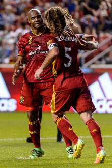 Real Salt Lake defender Jamison Olave (4) gets a high-five from teammate Kyle Beckerman (5)