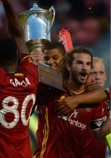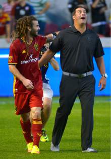 Real Salt Lake midfielder Kyle Beckerman (5) celebrates the 1-0 win as Real Salt Lake faces