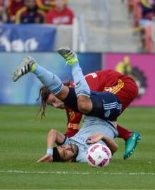 Sporting Kansas City midfielder Paulo Nagamura (6) goes heads over heels with Real Salt Lake midfielder Kyle Beckerman (5)as Real Salt Lake hosts Sporting KC in MLS soccer at Rio Tinto Stadium in Sandy, Sunday, Oct. 16, 2016.