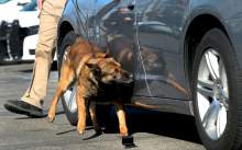 The handler walked the dog to the front of the car, gave it a command and began walking toward the back of the car. A split second after passing the piece of paper, Bear stopped, turned and started barking with nose pressed against the drugs.