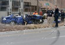 Salt Lake City police look at skid marks at the scene of an accident at 700 North 300 West Thursday, Feb. 16. The blue car going north on 300 West skidded, jumped the median and struck a southbound SUV. Two teenage passengers in the car were killed and the drivers of the car and the SUV were seriously injured.