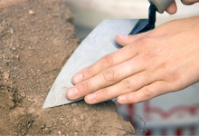 "It started clean, then got jumbled with rocks. This stuff you can crumble out, while it's tougher here," Thomas said. Using a trowel and brush, student Maren Bodily removed the dirt and places it into a plastic paint bucket.