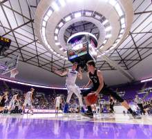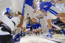 Bingham players huddle pre-game before facing Lone Peak in the 5A state high school basketb