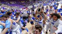 Bingham players and fans celebrate their win over Lone Peak in the 5A state high school bas