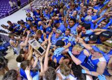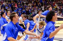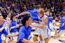 Bingham players celebrate their win over Lone Peak in the 5A state high school basketball c