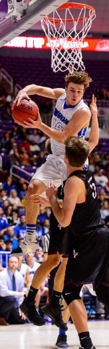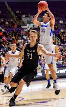 Bingham's Dason Youngblood (4) shoots over Lone Peak's Braden Bromley (43) as Bingham faces Lone Peak in the 5A state high school basketball championship game, Saturday March 4, 2017.