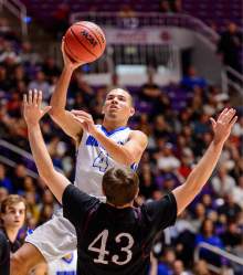 Lone Peak's Maxwell McGrath (31) shoots with Bingham's Branden Carlson (35) defending as Bi