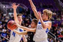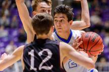 Lone Peak's Garrett Frampton (2) shoots the ball between Bingham's Branden Carlson (35) and