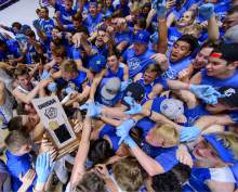 Bingham players and fans celebrate their win over Lone Peak in the 5A state high school basketball championship game, Saturday March 4, 2017.