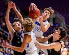 Bingham's Brayden Cosper (14) pulls down a rebound as Bingham faces Lone Peak in the 5A state high school basketball championship game, Saturday March 4, 2017.