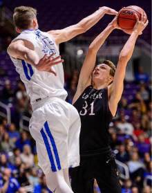 Lone Peak's Maxwell McGrath (31) shoots with Bingham's Branden Carlson (35) defending as Bingham faces Lone Peak in the 5A state high school basketball championship game, Saturday March 4, 2017.