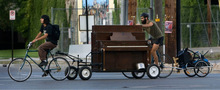 On the road by 7:30 a.m., one of the musicians rides the bike, towing the piano, while the other rides along on a second bike, transporting a piano seat and a tip container.