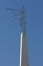 A tribute to the masonry trade includes a figure of Child holding a Bible and blueprints. A monument to the LDS priesthood includes a wire sculpture of the Angel Moroni.