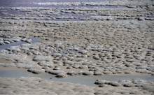 The North Arm's hypersaline waters produce salt crystals when the shallow waters cool in the winter, forming rock-hard mounds along the shore. Low water has exposed thousands of bioherms, rocky structures formed by microbial life that thrive in the lake.