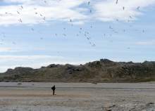 Thousands of gulls were already milling around on the bay's shore as researchers landed and fanned out. Seemingly out of nowhere, a group of six pelicans flew overhead, crossing the island without landing. A coyote appeared on the south shore and moved away from one research group, only to be spotted by another.