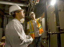 "He's patient," added Mendez, who has learned a lot about taking measurements, cutting PVC precisely and comprehending how the latticework of pipes keeps big buildings temperate.