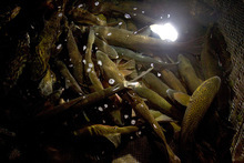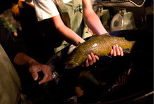 Once the fish have gone through the line of biologists, they are placed in large holding bins in the river to eliminate any chance they will be recaptured. At the end of the evening, typically around 1 a.m. or so, the cages are turned and the fish return to the river. Somewhere between 700 and 800 fish are caught each night of the project.