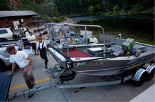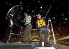 The survey which helps biologists determine the population and general health of the fish has been conducted for more than 20 years. DWR employees, joined by volunteers from other state and federal agencies and guides on the river, wait until dark and then launch a jet boat with two long rods sticking out in the front. Steel cables hang into the water as the boat captain maneuvers the vessel toward shore and flips the switch. And that is when the dancing starts.
