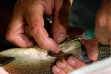 For some fish, the poking, prodding and injecting don't end at the PIT tag table. During the fall dates, biologists from the Bug Lab, also known as the Bureau of Land Management/Utah State University National Aquatic Monitoring Center, select a few fish to have their stomachs pumped as part of an ongoing diet study.
