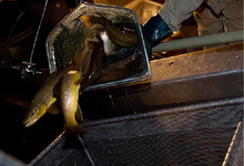 Others get hit with the wave of energy and stop moving altogether, making easy targets for the scoopers. Once the boat has made about a 1⁄3-mile run, the captain heads back to the ramp. The fish are moved to a holding bin in the river and then scooped in fours and fives to a big and hooded basin with a black light hanging over it like a reading lamp over a bed.