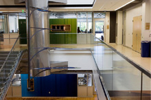Ample bicycle parking and proximity to public transit made additional campus parking unnecessary. Three-phase evaporative cooling lowers electrical use. The 21-kilowatt photo-voltaic array on the roof meets 3 percent of the building's power needs.