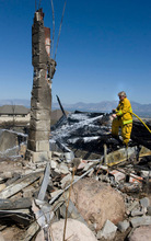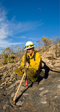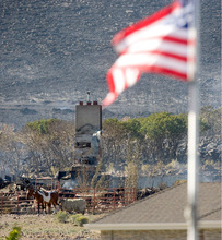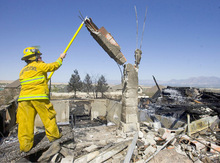 Lehi fire Capt. Kim Beck sprayed a fire hose on the smoking mass on a steep slope with rocks and remnants of burnt cactus and scrub oak.