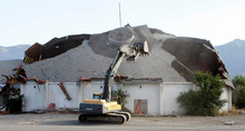 Riverdale's twin-domed cinemas an attraction for northern Utah moviegoers for more than 30 years met the wrecking ball Monday to make way for a new Larry H. Miller car dealership.