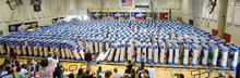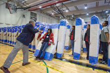 This time, 604 students, teachers, administrators, staff and parents were transformed into human dominoes. Each participant gripped a twin-size, plastic-wrapped mattress on both sides, lined up on the school's basketball court and waited to be struck by the force of hundreds of toppling mattresses and people. In three attempts, Eisenhower's best time was 21.43 seconds.