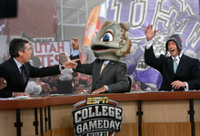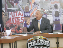 Lee Corso gets into an energetic description of how he feels the game will go as fans of both teams watch behind the GameDay set. The ESPN College Gameday program did its broadcast at the University of Utah prior to the TCU at Utah game, Saturday, 11/6/2010.