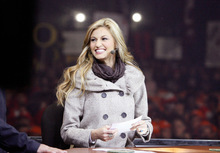 Popular ESPN analyst Erin Andrews smiles on the set of ESPN GameDay. The ESPN College Gameday priogram did its broadcast at the University of Utah prior to the TCU at Utah game, Saturday, 11/6/2010.