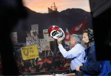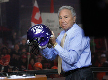 ESPN analyst Lee Corso teases the Ute fans by holding up a TCU helmet after he arrived on the set early Saturday morning. He would later pick TCU to win the game. The ESPN College Gameday program did its broadcast at the University of Utah prior to the TCU at Utah game, Saturday, 11/6/2010.