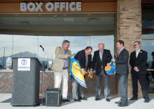 Taylorsville Mayor Larry Johnson and William J Stone, with S Squared Development, tear the ceremonial ticket, at the grand opening of the Regal Crossroads 14 on Thursday, March 16, 2017.