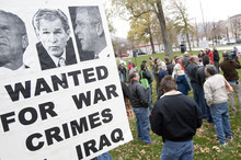 Beneath a blustery wind, about 60 protesters huddled Friday in Pioneer Park, cheering on speaker after speaker who excoriated former President George W. Bush as a "war criminal."