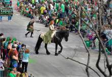 A horse and rider with a dedicated scooper during the 39th annual St. Patrick's Parade makes it's way through the Gateway shopping center, Saturday, March 18, 2017.