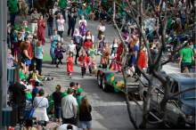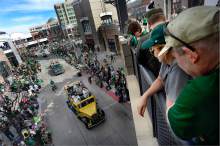 Parade watchers take in the 39th annual St. Patrick's Parade from one of the pedestrian overpasses as the parade makes its way through the Gateway shopping center on Saturday.