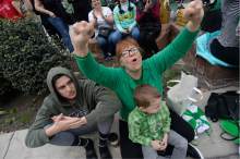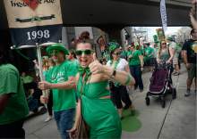 Parade watchers take in the 39th annual St. Patrick's Parade from one of the pedestrian o