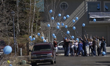 A crowd of maybe 20 friends and family hold balloons to welcome Elizabeth Smart home in March 2003.