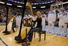 Elizabeth Smart, right, and sister Mary Katherine Smart play the National Anthem on their harps before the Jazz-Clippers game at EnergySolutions Arena on Dec. 26, 2006.