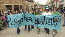 Participants in the 2003 St. Patrick's Day Parade at the Gateway celebrate her return a few