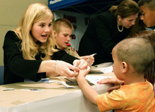 Elizabeth Smart helps 3-year-old Julian Lovato get fingerprinted at an event held at the Salt Lake Police Department's Pioneer Precinct in Salt Lake City in March 2005.
