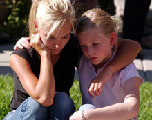 Elizabeth Smart's cousins Amanda Smart (left) and Tori Dumke console each other after a news conference where Edward Smart, the missing girl's father, spoke to reporters.