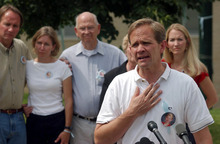 Ed Smart, front, alongside his brother, Tom, speaks to the media in February, 2003,